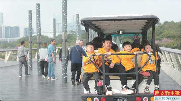 小“砂糖橘”被安排坐电瓶车在深圳人才公园内游览,其独特的打扮让路人一眼认出他们就是小“砂糖橘”。