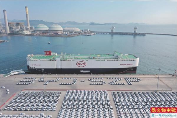 比亚迪首艘汽车滚装船在深汕小漠国际物流港装船。
