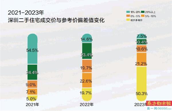 乐有家研究中心数据显示,2021年参考价政策出台第一年,深圳54.5%的房源成交价高于参考价20%以上,只有5%的房源成交价低于参考价。到2022年,低于参考价成交的占比上涨到19.7%。再看2023年全年,低于参考价成交的占比大幅增长至50.3%。由此可见,3年时间,低于参考价成交的房源占比大升,参考价显然已经是影响市场交易的重要指标。