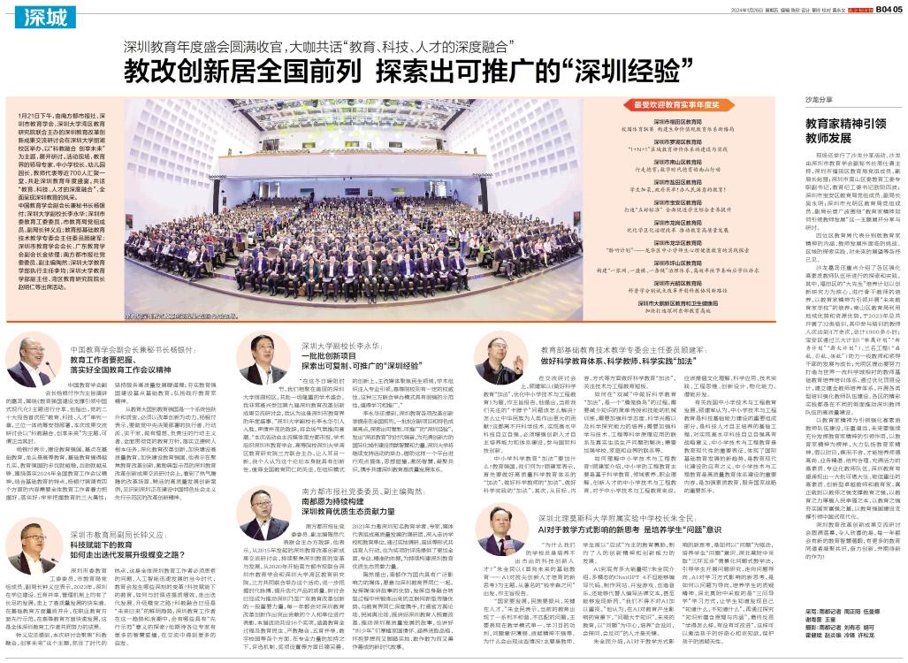 1月21日下午,由南方都市报社、深圳市教育学会,深圳大学湾区教育研究院联合主办的深圳教育改革创新成果交流研讨会在深圳大学丽湖校区举办,以“科教融合 创享未来”为主题,展开研讨。活动现场,教育界的领