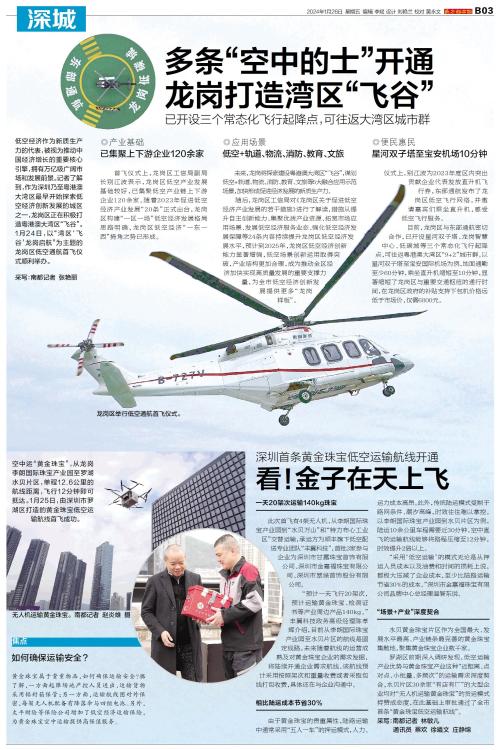 空中运“黄金珠宝”,从龙岗李朗国际珠宝产业园至罗湖水贝片区,单程12.6公里的航线距离,飞行12分钟即可抵达。1月25日,由深圳市罗湖区打造的黄金珠宝低空运输航线首飞成功。 一天20架次运输14