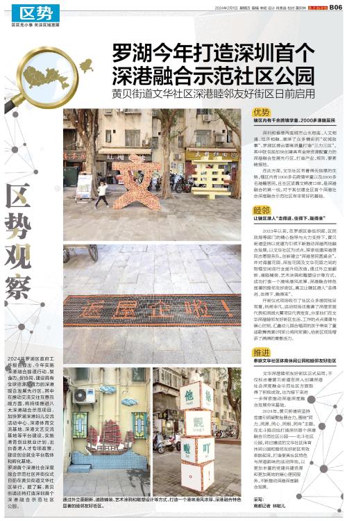 2024年罗湖区政府工作报告提出,今年实施深港融合提速行动,聚合力、促协同,建设具有全球资源配置力的深港融合发展先行区。其中在推动交流交往互惠互融方面,将持续推进八大深港融合示范项目,加快罗湖深港