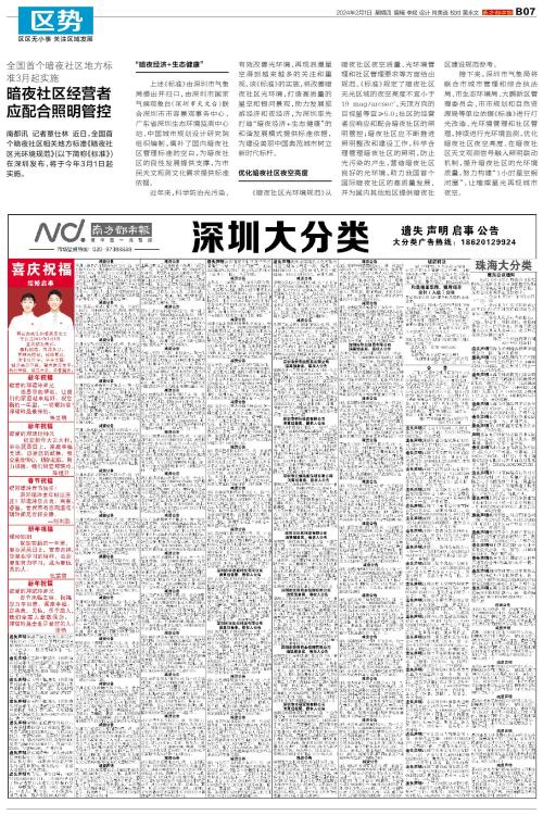 南都讯 记者覃仕林 近日,全国首个暗夜社区相关地方标准《暗夜社区光环境规范》(以下简称《标准》)在深圳发布,将于今年3月1日起实施。 “暗夜经济+生态健康” 上述《标准》由深圳市气象局提出