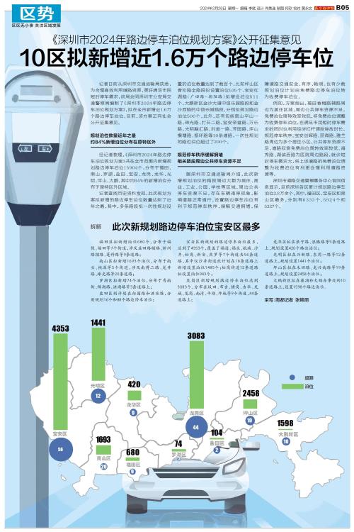 记者日前从深圳市交通运输局获悉,为合理高效利用道路资源,更好满足市民短时停车需求,该局会同深圳市公安局交通警察局编制了《深圳市2024年路边停车泊位规划方案》,拟在全市新增近1.6万个路边停车泊位
