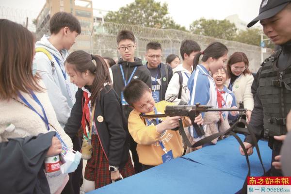 参观学生在现场体验警用装备。 本版供图:深圳公安