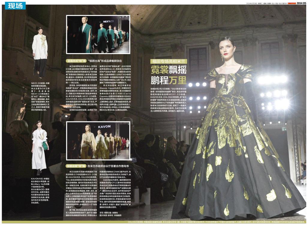 当地时间2月23日傍晚,“2024秋冬米兰时装周·深圳福田时尚盛典”举办,来自深圳福田的高端时尚品牌NEXY.CO奈蔻、KAVON卡汶、CHLOSIO克劳西,在“米兰时装周”顶级秀场米兰王宫组团亮