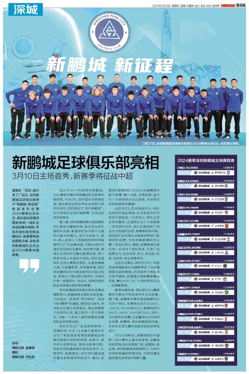 南都讯 “深圳,我们来了!”近日,深圳新鹏城足球俱乐部举行“新鹏城 新征程”新闻发布会暨2024赛季出征仪式,俱乐部总经理汤锡钢率领一线队全体成员集中亮相,并发布俱乐部全新品牌标识、新赛季阵容和票