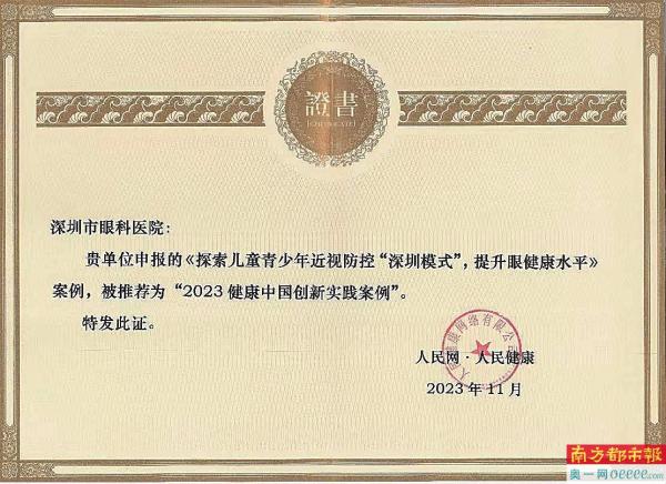 儿童青少年近视防控“深圳模式”获得了认可,并在全国进行推广和应用。经过五年的探索与努力,儿童青少年近视防控“深圳模式”荣获“2021健康中国创新实践案例”,并受邀在首届人民健康大会暨2021健康中国创新实践案例总结大会上分享近视防控“深圳模式”;荣获2022年广东省医院党建创新案例,并在广东省进行推广;荣获“2022健康中国行动创新实践案例”“2023年健康中国行动创新实践案例”;并在“学习强国”平台进行推广。