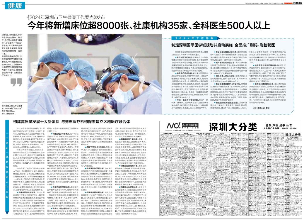 3月1日,深圳召开2024年全市卫生健康工作会议,为2024年吹响“冲锋号”。会议强调,“十四五”下半段,深圳要调整完善卫生健康发展策略,加快构建高质量发展十大新体系。 深圳卫健委发布《2024