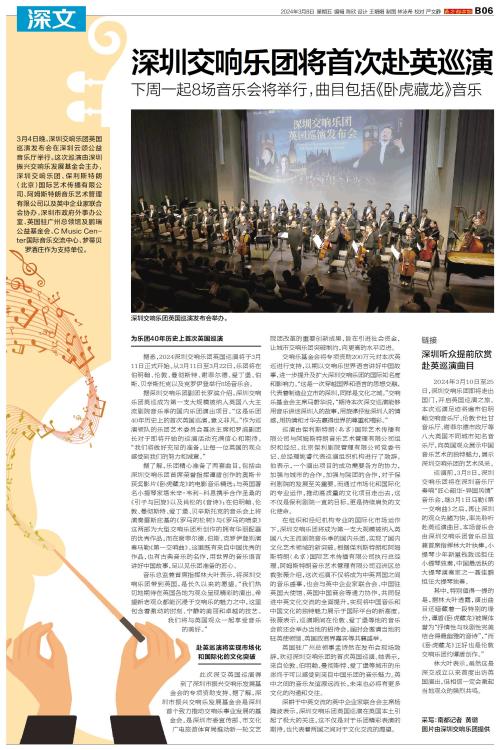 3月4日晚,深圳交响乐团英国巡演发布会在深圳云颂公益音乐厅举行。这次巡演由深圳振兴交响乐发展基金会主办,深圳交响乐团、保利斯特朗(北京)国际艺术传播有限公司、阿姆斯特朗音乐艺术管理有限公司以及英中