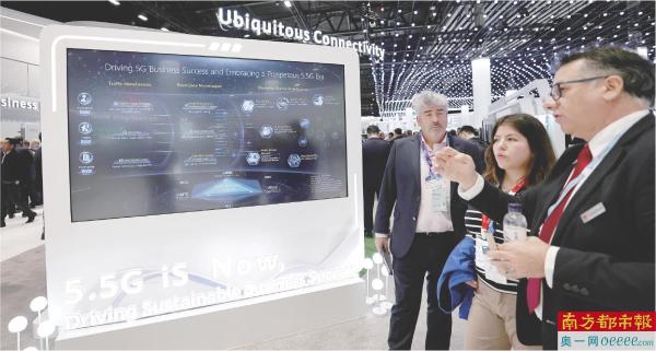 2月28日,在西班牙巴塞罗那举行的2024年世界移动通信大会上,人们在华为展台关注5G-A技术。 新华社发