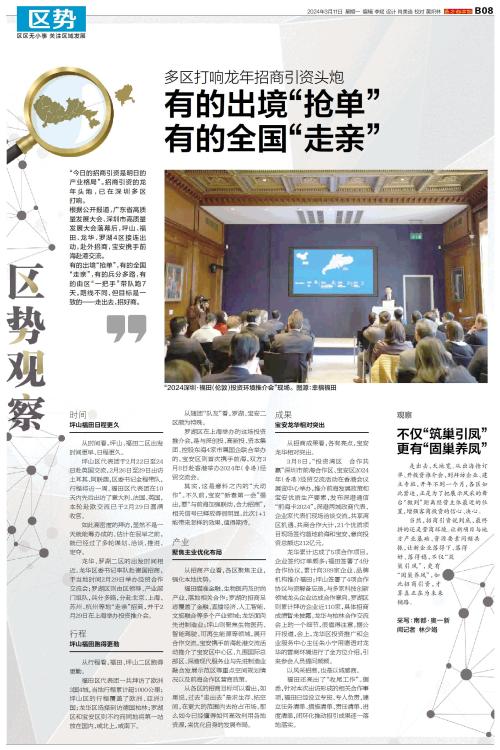 “今日的招商引资是明日的产业格局”。招商引资的龙年头炮,已在深圳多区打响。 根据公开报道,广东省高质量发展大会、深圳市高质量发展大会落幕后,坪山、福田、龙华、罗湖4区接连出动,赴外招商,宝安携手