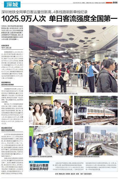 3月8日,深圳市城市轨道交通全网客运量(含有轨电车)达到1025.9万人次,2024年首次刷新客运纪录,也是深圳地铁第二次突破单日千万客运量。当日,深圳市地铁线网客流强度为1.84万人次/公里,位