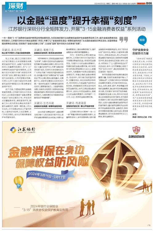 一年一度的“3·15”消费者权益保护教育宣传周如期而至。为切实做好银行业消费者权益保护和金融教育宣传工作,提升金融消费者风险防范意识,江苏银行深圳分行响应监管部门号召,开展了以“金融消保在身边 保