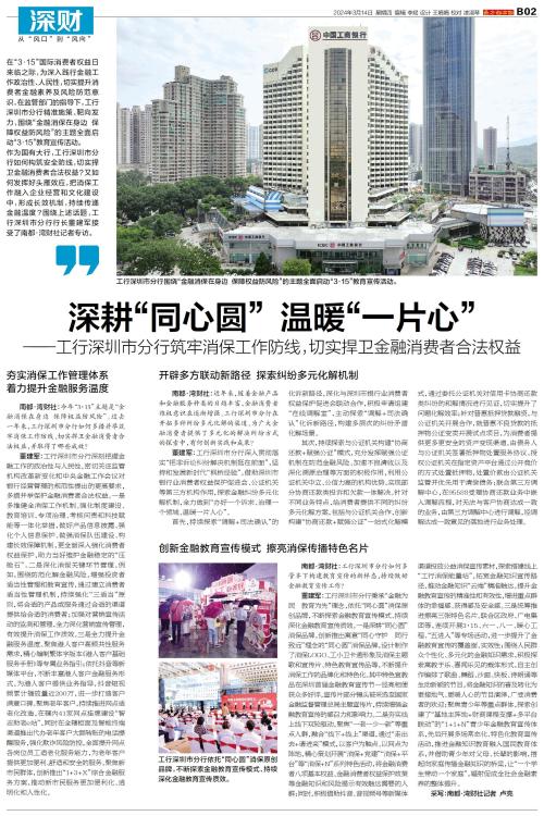 在“3·15”国际消费者权益日来临之际,为深入践行金融工作政治性、人民性,切实提升消费者金融素养及风险防范意识,在监管部门的指导下,工行深圳市分行精准施策、靶向发力,围绕“金融消保在身边 保障权益