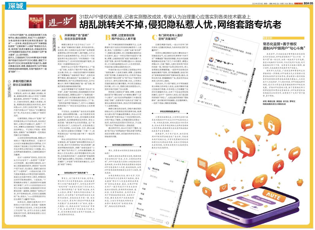 一打开APP满屏广告、眨眼就跳转第三方购物平台;通过过度索权,形成了个人信息黑产,为电信网络诈骗等互联网犯罪提供“温床”……近年来,网友苦手机APP“开屏弹窗乱跳转”“过度收集个人信息”等侵权行为