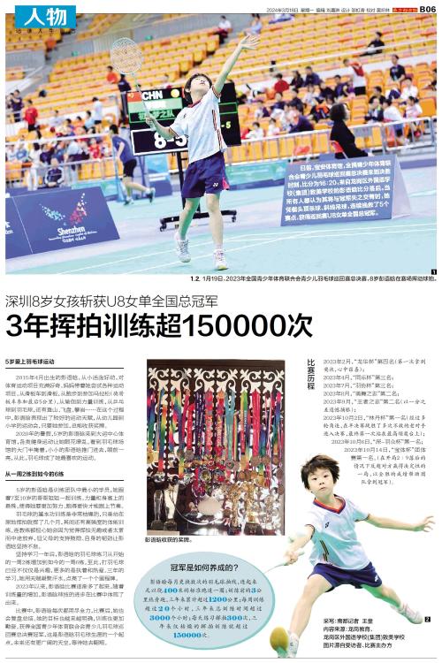 日前,宝安体育馆,全国青少年体育联合会青少儿羽毛球巡回赛总决赛来到决胜时刻,比分为16∶20,来自龙岗区外国语学校(集团)致美学校的彭语晗比分落后。当所有人都认为其将与冠军失之交臂时,她凭借头顶杀