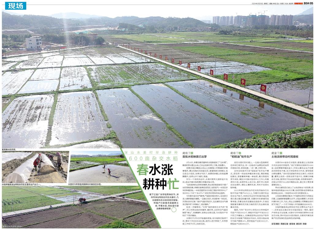 眼下正是广东早稻育秧时节。深圳市深汕特别合作区水美村,几台旋耕机在水田间来回穿梭,种植户们拿着农具翻耕土地、平整水田,到处是忙碌的春耕备耕场景。 藏粮于技 首批水稻秧苗已出芽 3月18日,