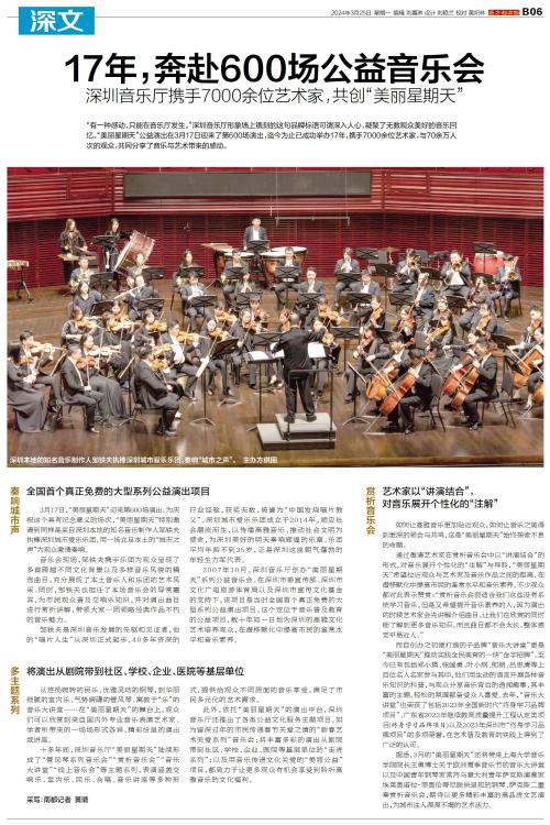 “有一种感动,只能在音乐厅发生。”深圳音乐厅形象墙上镌刻的这句品牌标语可谓深入人心,凝聚了无数观众美好的音乐回忆。“美丽星期天”公益演出在3月17日迎来了第600场演出,迄今为止已成功举办17年,