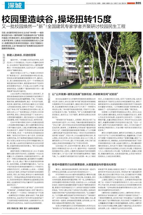 日前,由《建筑学报》杂志社主办的“林中路——福田新校园行动8+1建筑联展三校园建成研讨会”在荔园外国语小学(景田)举行。来自全国建筑专家学者、行业大咖齐聚深圳,以建成三校的现场踏勘为切入口研讨,梳
