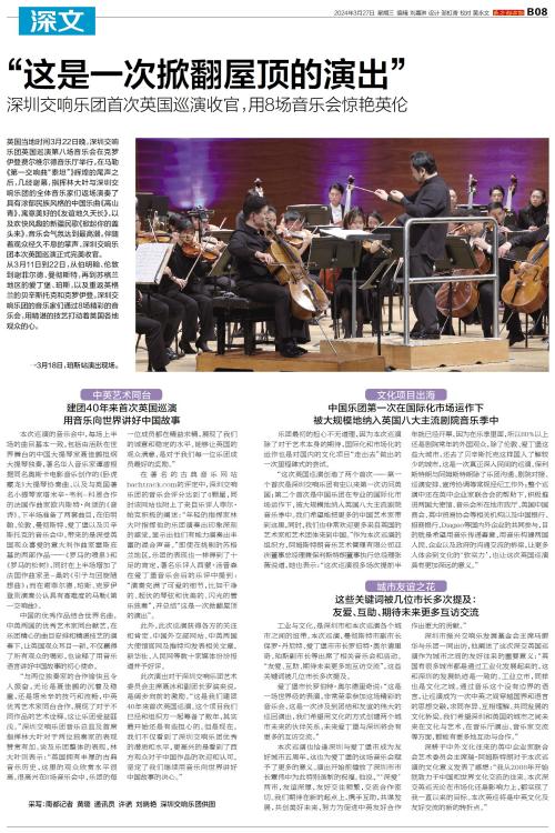 英国当地时间3月22日晚,深圳交响乐团英国巡演第八场音乐会在克罗伊登费尔维尔德音乐厅举行。在马勒《第一交响曲“泰坦”》辉煌的尾声之后,几经谢幕,指挥林大叶与深圳交响乐团的全体音乐家们返场演奏了具有