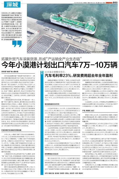 3月26日上午,装载3258辆比亚迪新能源汽车的“唐鸿轮”大型滚装船缓缓驶出深圳市深汕特别合作区小漠国际物流港(以下简称“小漠港”),启程前往巴西维多利亚港。今年一季度,小漠港汽车滚装出口业绩斐然