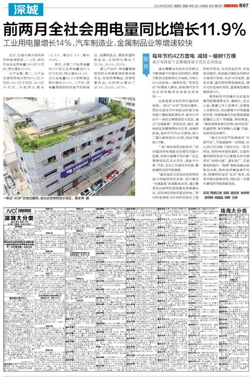 近日,记者从南方电网深圳供电局获悉,1-2月,深圳市全社会用电量140.8亿千瓦时,同比增长11.9%。 分产业看,第二、三产业及居民用电分别为70.3亿千瓦时、50.1亿千瓦时、20.3亿千瓦