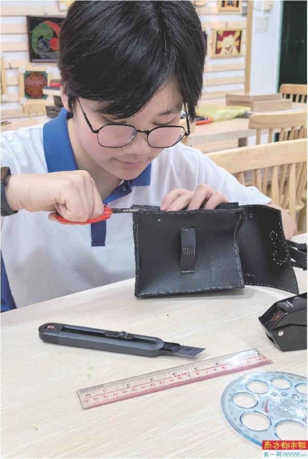 学生汪欣钰用一双巧手、一把剪刀、一张皮布、一盒订书钉,就做出兼具质感和美感的手拿和斜挎两用包包。