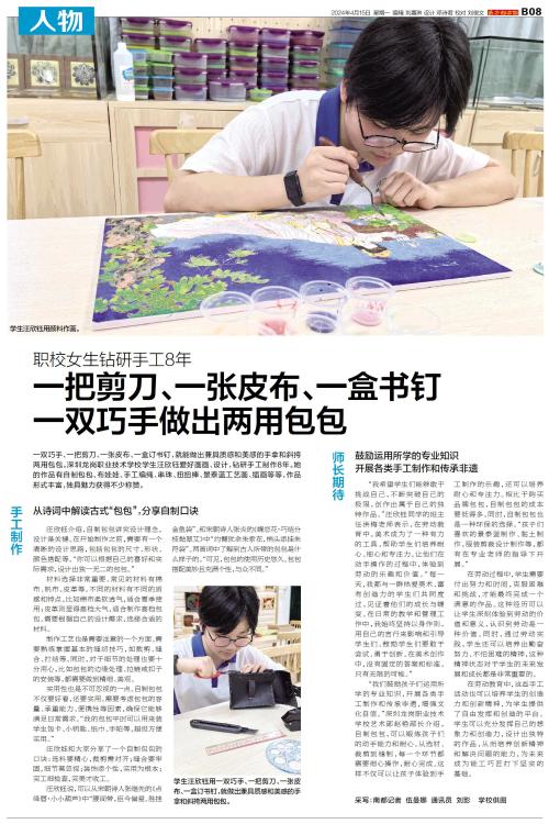 一双巧手、一把剪刀、一张皮布、一盒订书钉,就能做出兼具质感和美感的手拿和斜挎两用包包。深圳龙岗职业技术学校学生汪欣钰爱好画画、设计,钻研手工制作8年。她的作品有自制包包、布娃娃、手工编绳、串珠、扭
