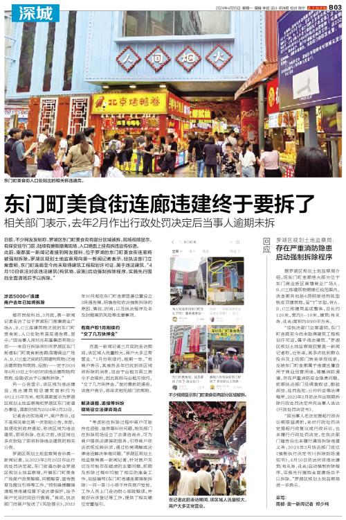 日前,不少网友发帖称,罗湖区东门町美食街有部分区域被拆。现场视频显示,有保安驻守门前,陆续有摊贩撤离现场,入口墙面上挂有拆违宣传标语。 此前,南都奥一新闻记者接到网友报料,位于罗湖的东门町美食街