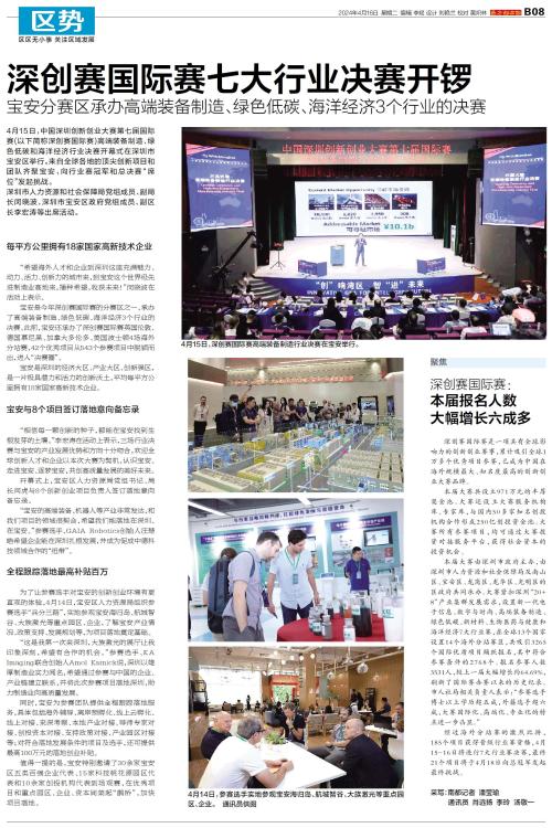 4月15日,中国深圳创新创业大赛第七届国际赛(以下简称深创赛国际赛)高端装备制造、绿色低碳和海洋经济行业决赛开幕式在深圳市宝安区举行。来自全球各地的顶尖创新项目和团队齐聚宝安,向行业赛冠军和总决赛