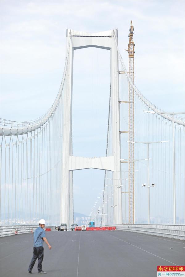 4月16日,深中通道伶仃洋大桥已铺设沥青路面,等待画线。 南都记者 赵炎雄 霍健斌 摄
