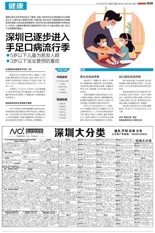 南都记者从深圳市疾控中心了解到,近期,深圳市手足口病发病水平出现明显上升,已逐步进入夏季流行季。气温升高、雨水充沛,均是病原体生长繁殖的有利因素。往年的监测结果显示,深圳市手足口病发病高峰集中在每