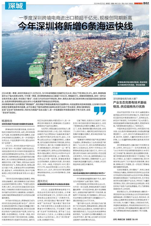 2024年第一季度,深圳外贸进出口1.02万亿元,为10年来同期首次突破万亿元大关,同比(下同)增长28.8%。其中,跨境电商显示出了强大的增长韧性。今年第一季度,深圳跨境电商进出口额超1100亿