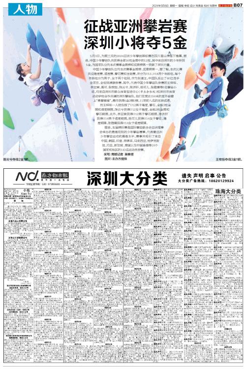 5月3日,为期三天的2024亚洲少年攀岩锦标赛在四川眉山市落下帷幕。据悉,中国少年攀岩队共获得全部16枚金牌中的12枚,其中来自深圳的少年斩获5金,为国家队位列本次赛事金牌榜和奖牌榜第一贡献了深圳