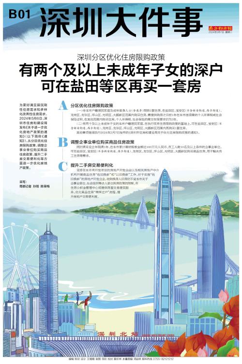 为更好满足居民刚性住房需求和多样化改善性住房需求,2024年5月6日,深圳市住房和建设局发布《关于进一步优化房地产政策的通知》(以下简称《通知》),从分区优化住房限购政策、调整企事业单位购买商品住房政策、提升二手房交易便利化等方面进一步优化房地产政策。