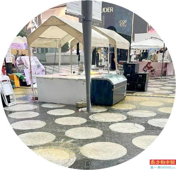 此外,还有网友反映称,现场有多个排水口往外冒出黄色污水,臭味弥漫。面对棚顶漏水、现场停电和污水横流,多数品牌方选择保护好自己的设备后撤离到商城内躲雨,仅有少数品牌在做好防水措施后坚持营业。