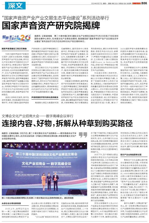 南都讯 记者谢湘南 第二十届中国(深圳)国际文化产业博览交易会于5月23日至27日在深圳国际会展中心举办。在本届文化产业博览会期间,备受瞩目的“国家声音资产全产业交易生态平台建设”系列活动于5月2
