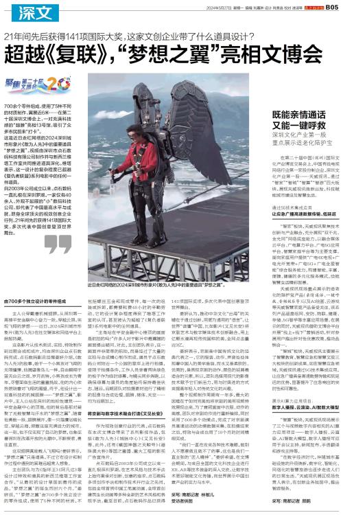700余个零件组成、使用了5种不同的材质制作、翼展近6米……在第二十届深圳文博会上,一对充满科技感的“翅膀”亮相13号馆,吸引了众多市民前来“打卡”。 这是近日走红网络的2024深圳城市形象片《