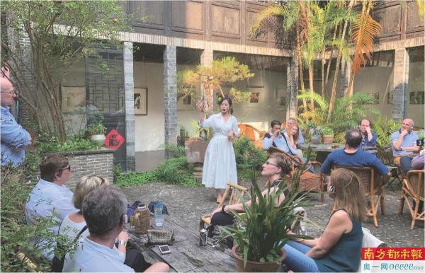 太阳山艺术中心负责人陈山叶(着白裙者)对外国友人进行讲解。