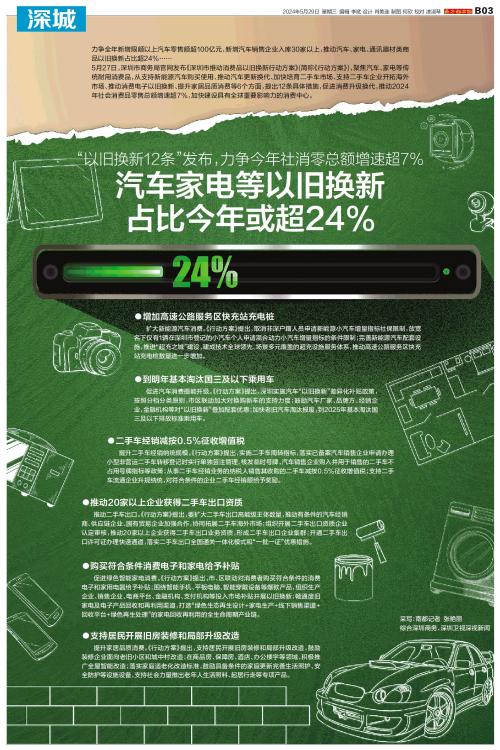 力争全年新增限额以上汽车零售额超100亿元,新增汽车销售企业入库30家以上,推动汽车、家电、通讯器材类商品以旧换新占比超24%…… 5月27日,深圳市商务局官网发布《深圳市推动消费品以旧换新行动