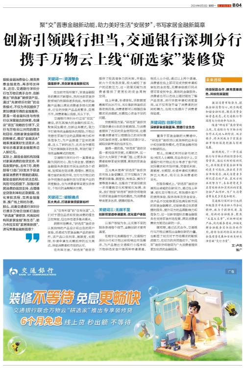 提振金融消费信心,擦亮普惠金融底色,再添特区样本。近日,交通银行深圳分行与万物云携手合作,创新推出“研选家”装修贷产品,通过“先装修后付款”的业务模式,不仅为市民提供了更加便捷可得的金融服务,更是