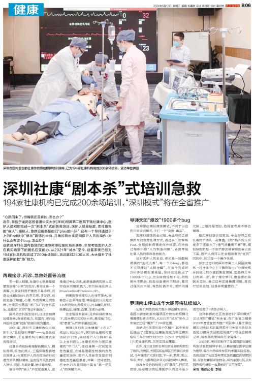 “心跳回来了,但嘴唇还是紫的,怎么办?” 近日,在位于龙岗区的香港中文大学(深圳)附属第二医院下辖社康中心,医护人员刚刚完成一次“剧本杀”式的急救培训,医护人员是玩家,而社康里的“病人”、模拟人
