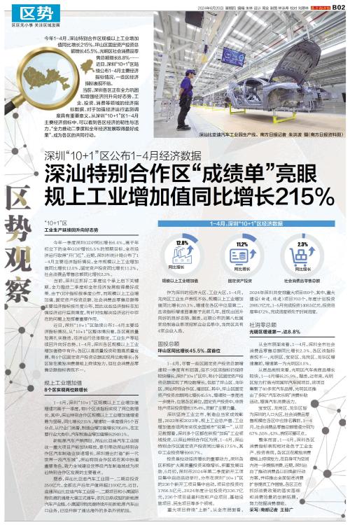 今年1-4月,深汕特别合作区规模以上工业增加值同比增长215%,坪山区固定资产投资总额增长45.5%,光明区社会消费品零售总额增长8.8%……近日,深圳“10+1”区陆续公布1-4月主要经济指标情