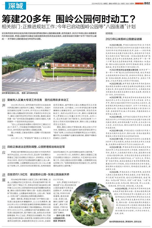 近日有市民在深圳论坛先后两次发帖询问罗湖区围岭公园的建设进展。该市民表示,自2021年底公园土地整备签约后再无消息,希望公园能早日建成为居民提供良好的休闲运动场所。目前项目进行到哪个环节?何时可以