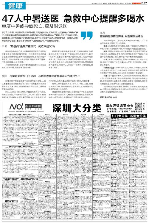 下了几个月雨,深圳最近几天降雨减弱,天气趋于炎热。又热又湿,出门就开启“蒸桑拿”模式,这意味着中暑的风险将增加。南都记者从深圳市急救中心了解到,6月1日到6月18日,深圳有47人因中暑呼叫120急