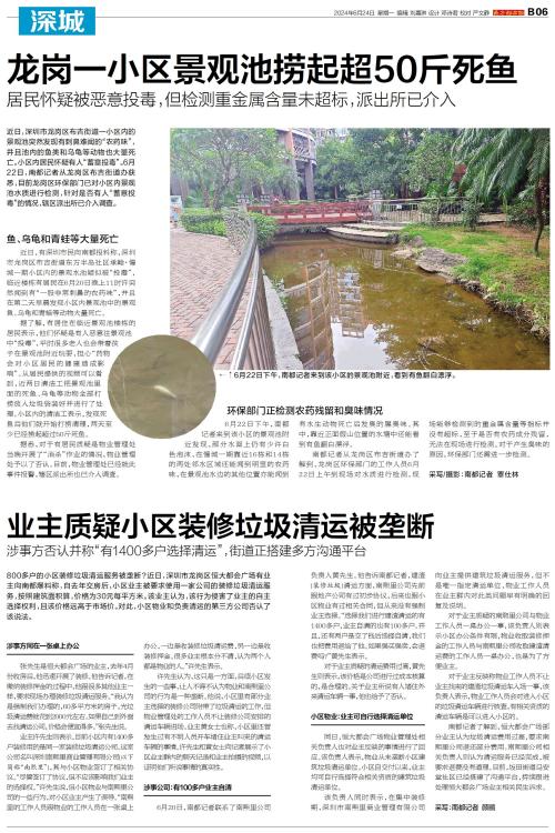 近日,深圳市龙岗区布吉街道一小区内的景观池突然发现有刺鼻难闻的“农药味”,并且池内的鱼类和乌龟等动物也大量死亡。小区内居民怀疑有人“蓄意投毒”。6月22日,南都记者从龙岗区布吉街道办获悉,目前龙岗