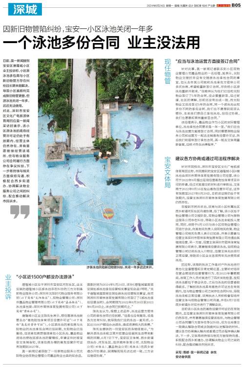 日前,奥一新闻接到宝安区港隆城小区业主投诉称,小区原泳池承包商与小区新旧物管方存在纠纷且长期未能解决,导致小区虽顺利完成新旧物管更替,但游泳池关闭一年多,迟迟无法使用。 对此,深圳市宝安区文化广