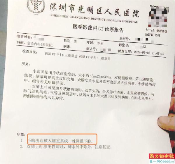 一份来自光明区人民医院的CT诊断证明显示,患者李杰小脑出血破入脑室系统、蛛网膜下腔出血。李先生向南都·奥一新闻记者提供了一份医院记录,其中提到,急救车到达现场后,患者无自主呼吸及脉搏,胸外按压后恢复自主呼吸及脉搏;入院后患者处于深昏迷状态,自主呼吸不明显,依靠去甲肾上腺素维持血压。