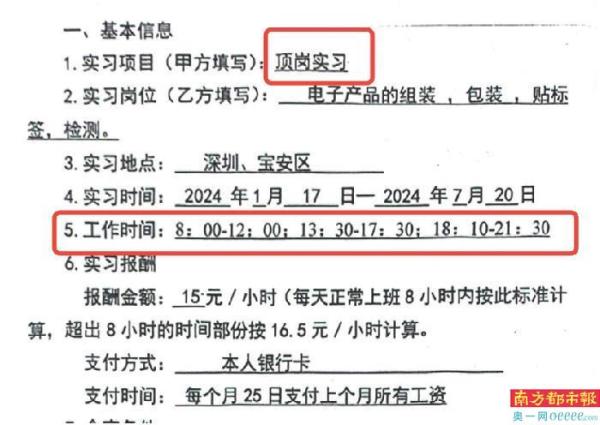 另一位学生家长刘先生向南都·奥一新闻记者提供了一份实习三方协议,其中实习项目为“顶岗实习”,实习岗位为“电子产品的组装、包装、贴标签、检测”。同时,学生实习的工作时间为上午8点至中午12点,午饭后,由13点半工作至17点半,晚饭过后,由18点10分工作至21点半,每天需进行近12小时的实习工作。